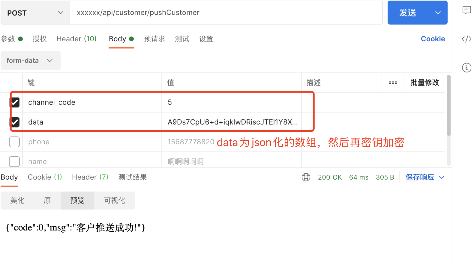 data参数说明:首先是一个包括以下参数的数组结构体,必须包括的数组元素有客户姓名、手机号,分别是name、phone。